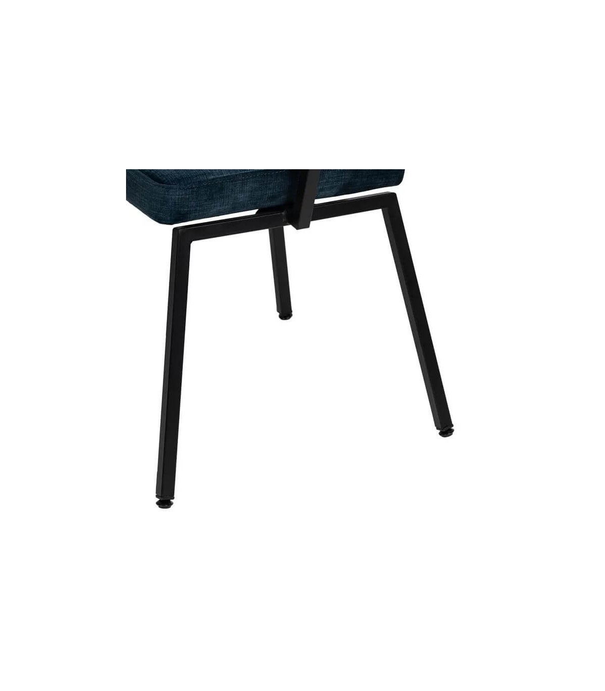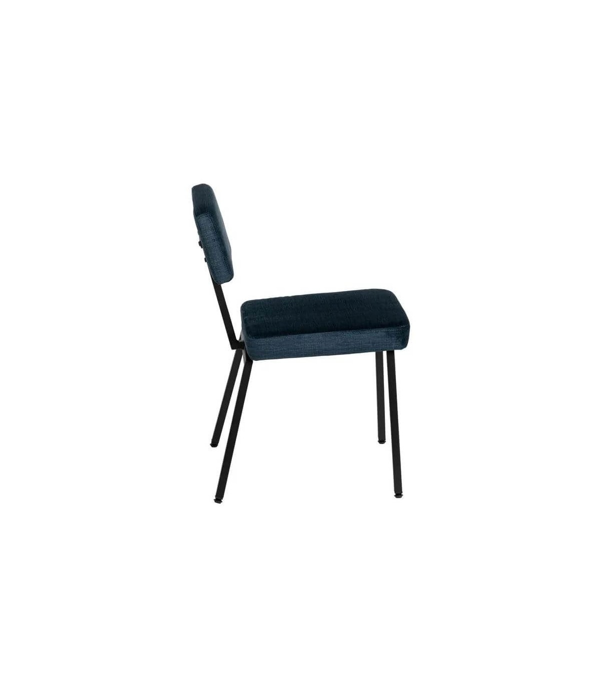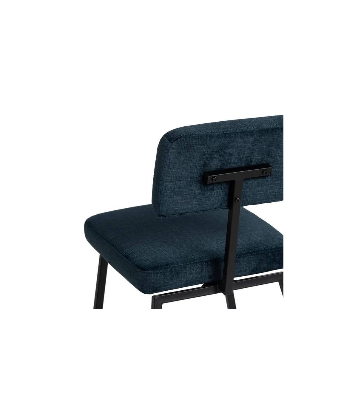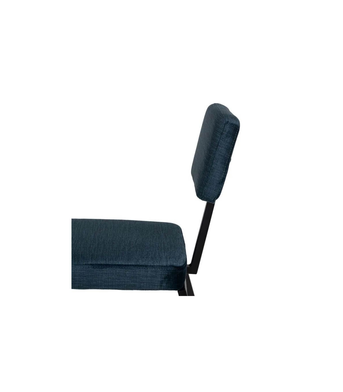 Silla de estructura diseño, con la estructura en metal color negro y tapizada en chenilla color azul, Una silla de líneas neutras que combina en cualquier estilo de comedor.
