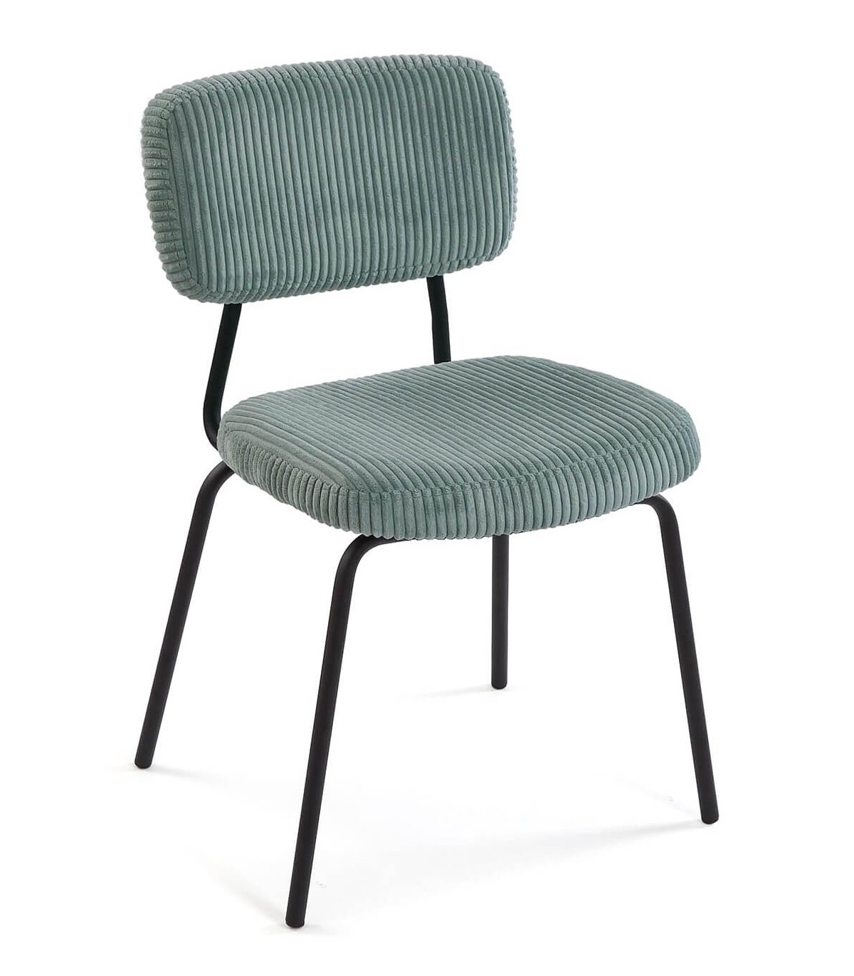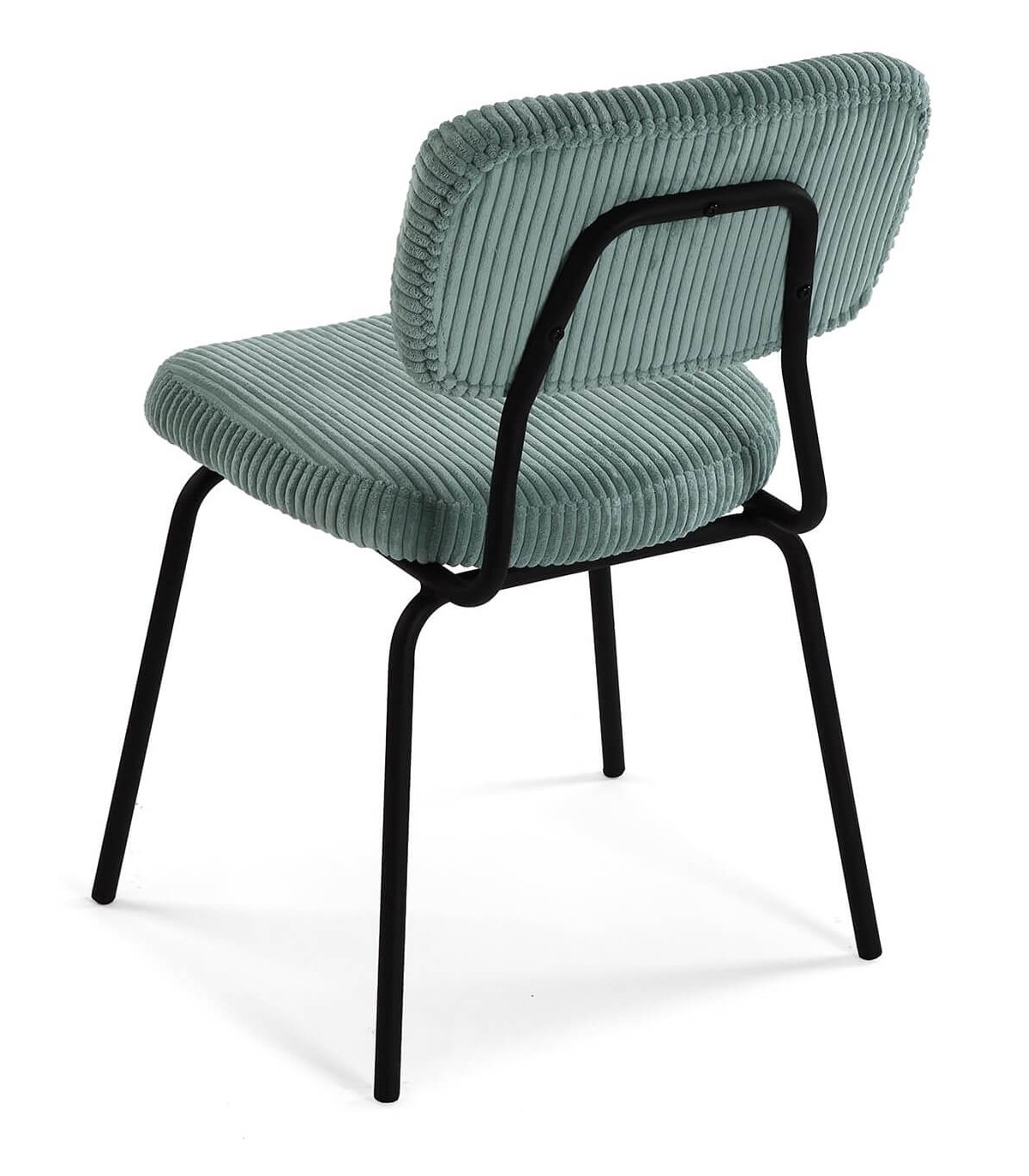 Silla de comedor muy cómoda, con el asiento y el respaldo tapizados, estilo industrial, con la estructura en acero acabada en negro y el tapizado en pana color menta, perfecta para crear ambientes sofisticados y elegantes.