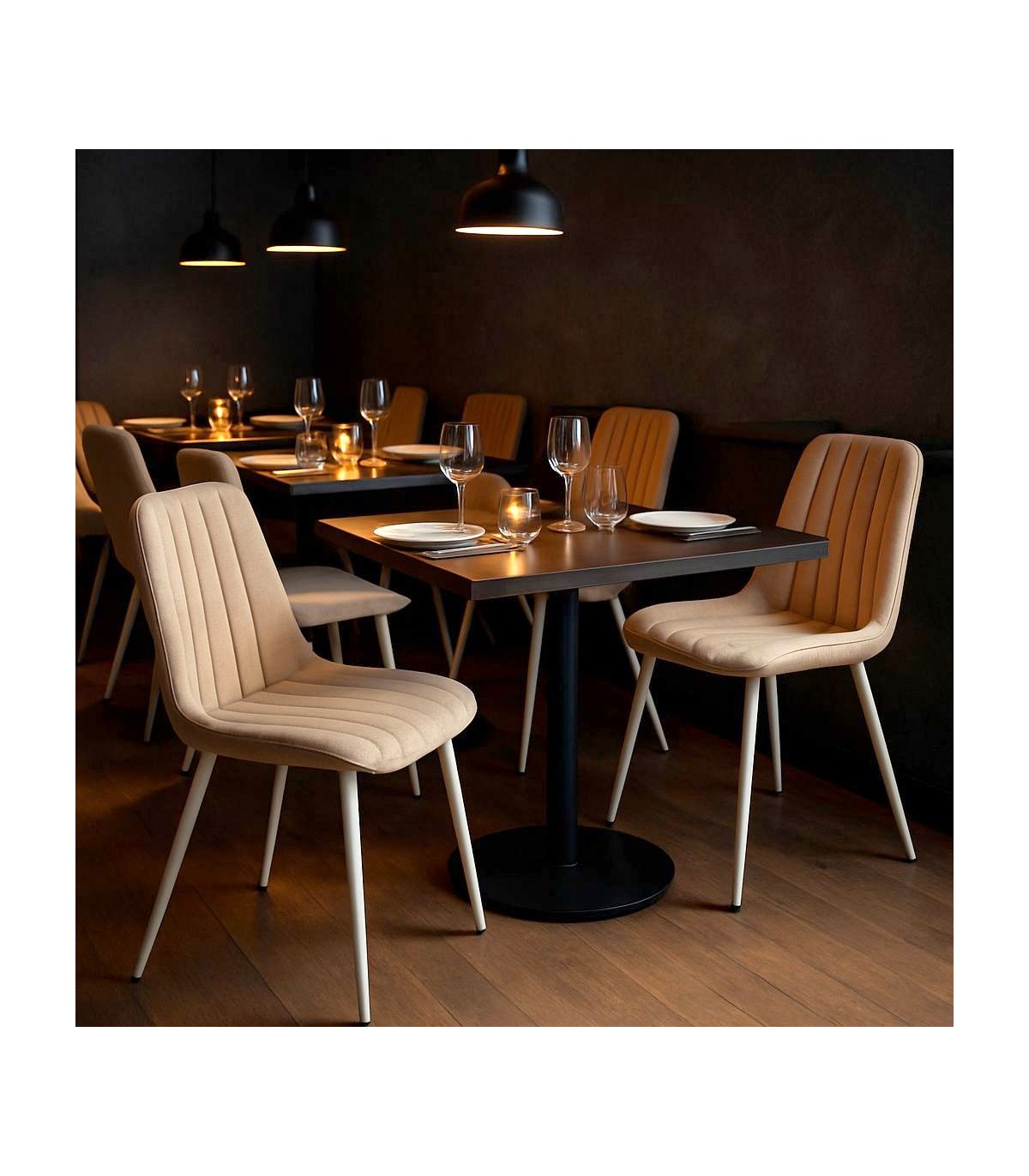 Su estructura sólida se une a un asiento acolchado que garantiza comodidad prolongada, invitando a disfrutar de comidas y reuniones con estilo. Las patas metálicas en acabado claro añaden estabilidad y un toque moderno, reforzando la ligereza estética del conjunto. Una pieza práctica y funcional, perfecta para hostelería o para el hogar.