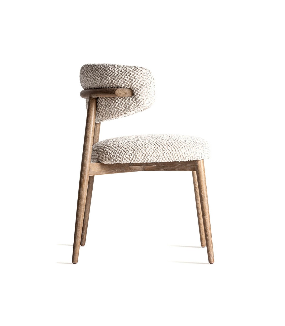Silla de comedor cómoda, realizada en madera de fresno natural tapizada en tela de nudos blanca con el fondo en marrón, una silla de calidad que le dará a tu comedor una nota elegante.