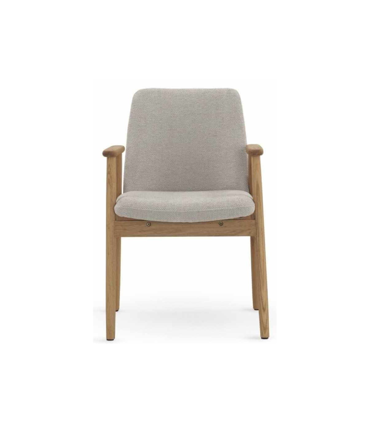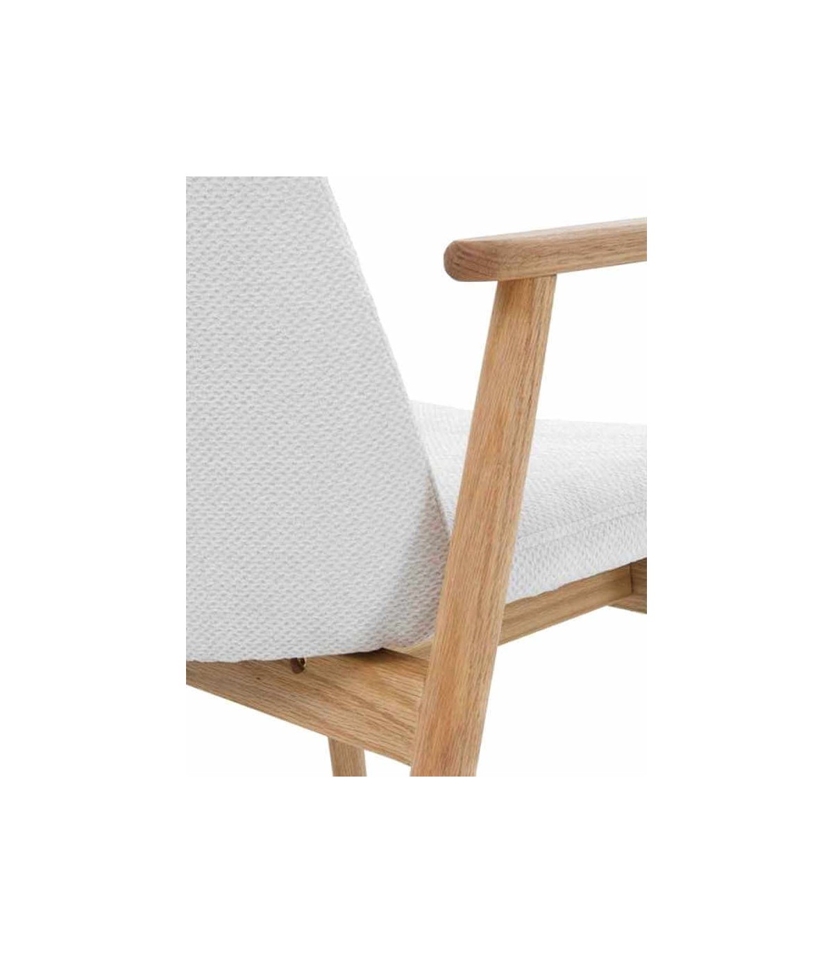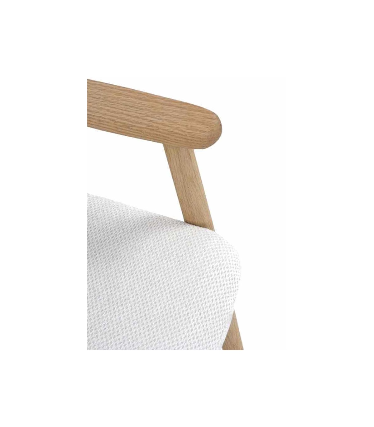 Sillón de comedor cómodo, realizado en madera de roble natural tapizada en tela chenilla color blanco, un sillón de calidad que le dará a tu comedor fresco y actual.