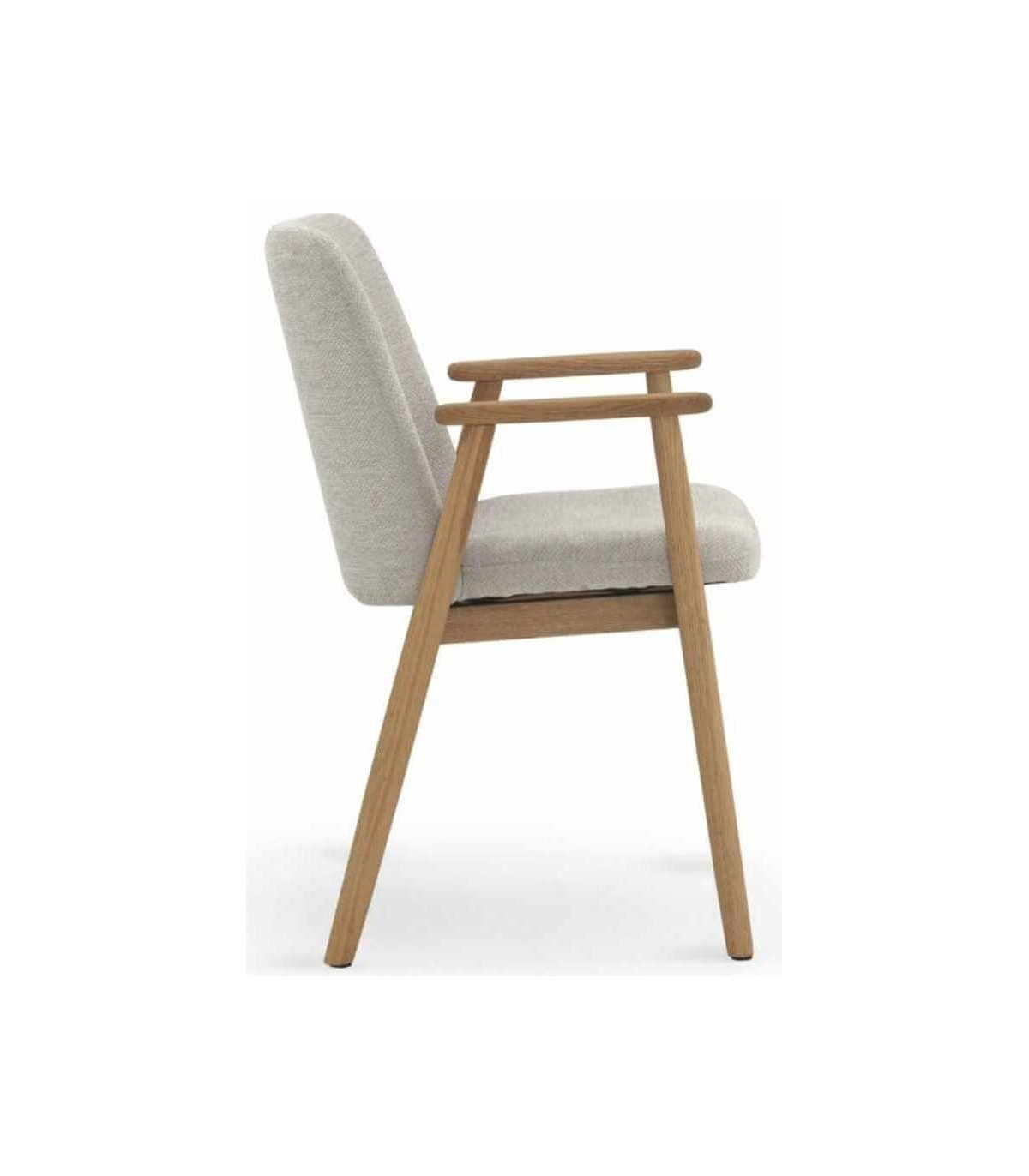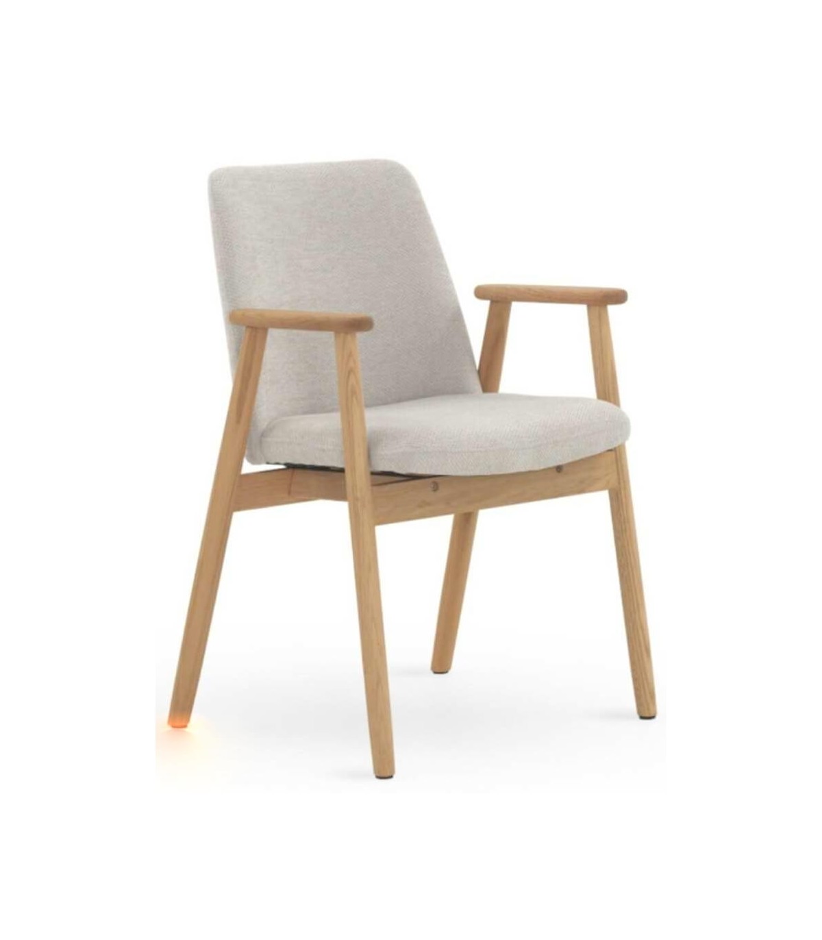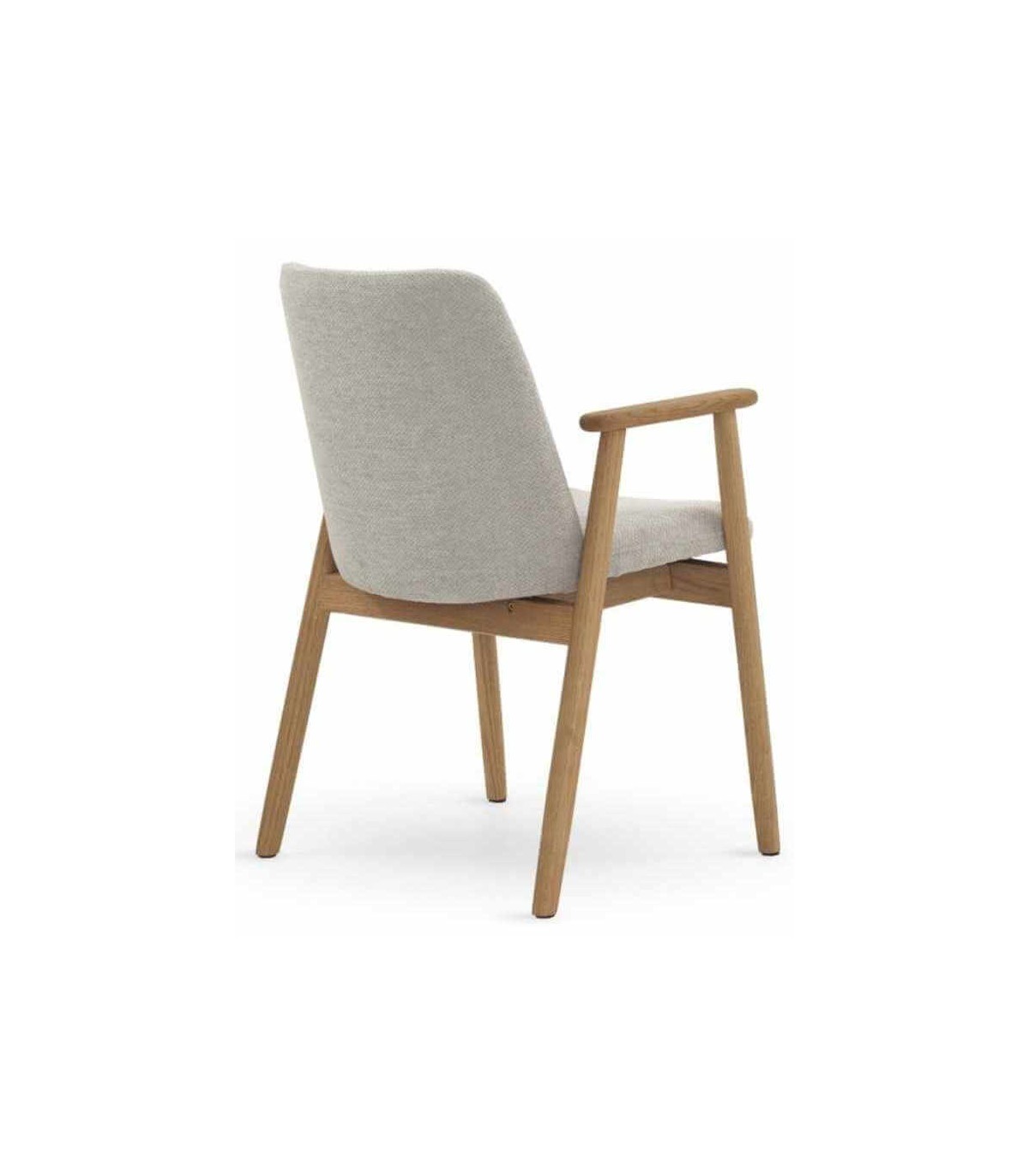 Sillón de comedor cómodo, realizado en madera de roble natural tapizada en tela chenilla color blanco, un sillón de calidad que le dará a tu comedor fresco y actual.