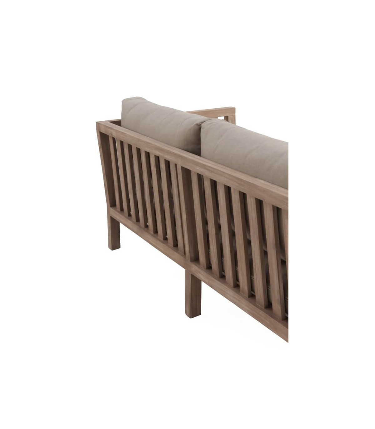 Sofá de 2 plazas, realizado en madera maciza de acacia acabado natural con una pátina para exterior con los cojines tapizados en tela hidrófuga color topo, un sofá para exterior o porches.