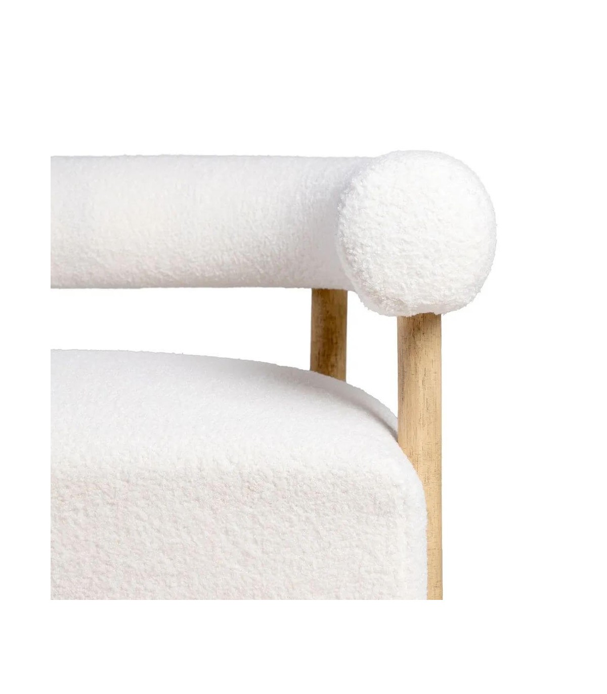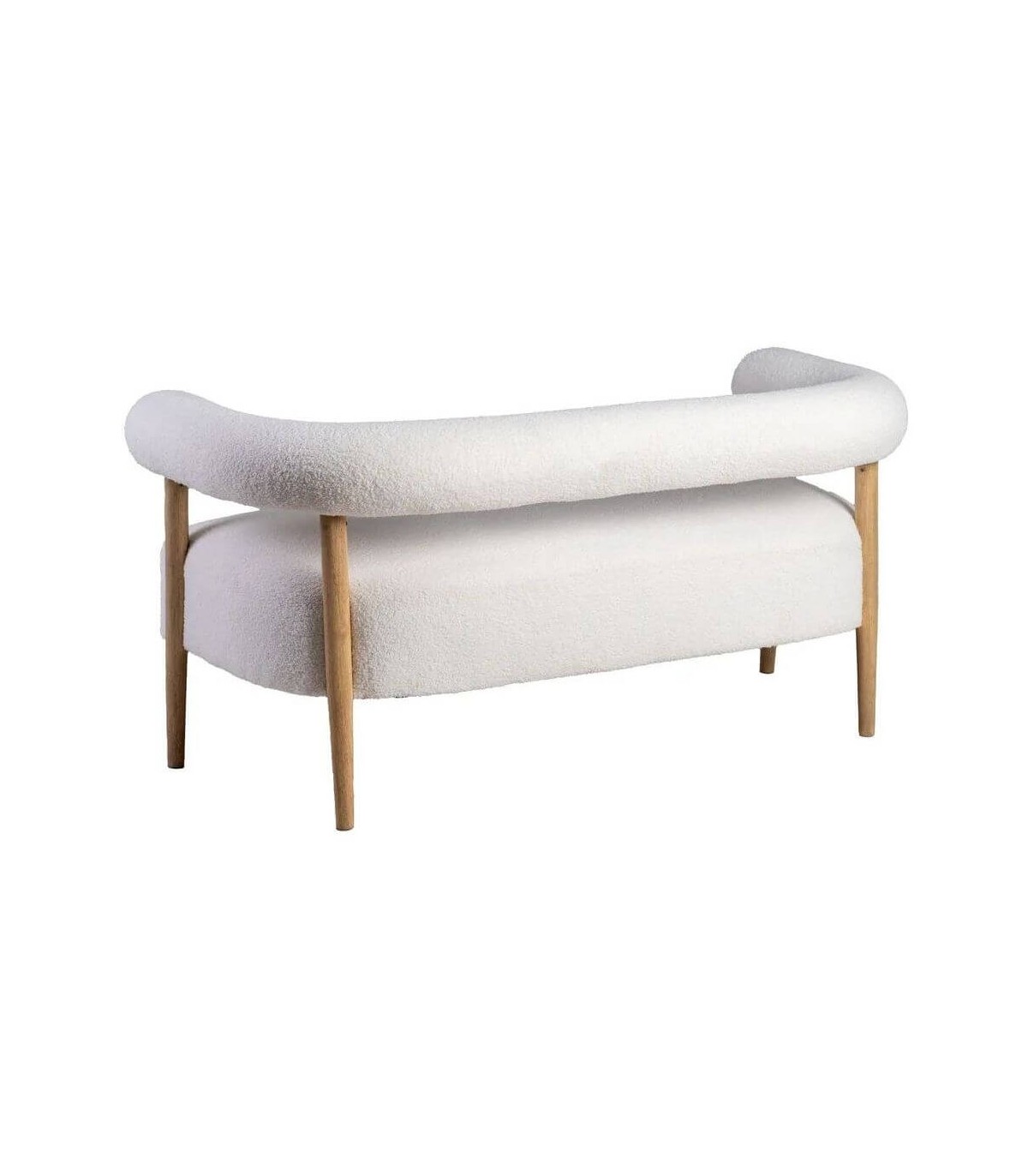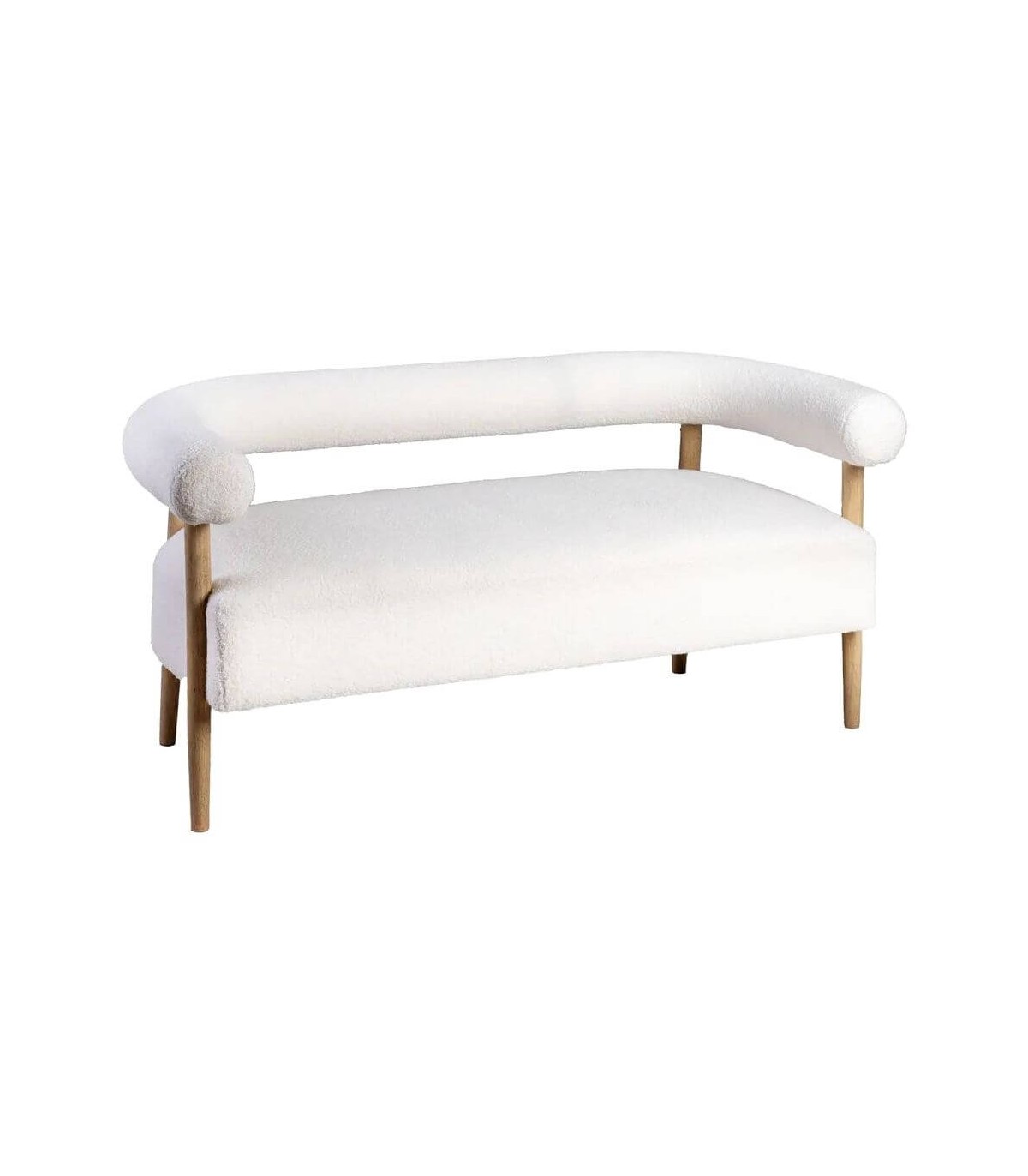 Sofá pequeño de líneas curvas con estructura vista de madera natural y tapizado en suave tejido bouclé blanco. Su diseño abierto con respaldo envolvente y formas redondeadas crea una pieza acogedora y visualmente ligera, ideal para espacios contemporáneos, escandinavos o minimalistas.