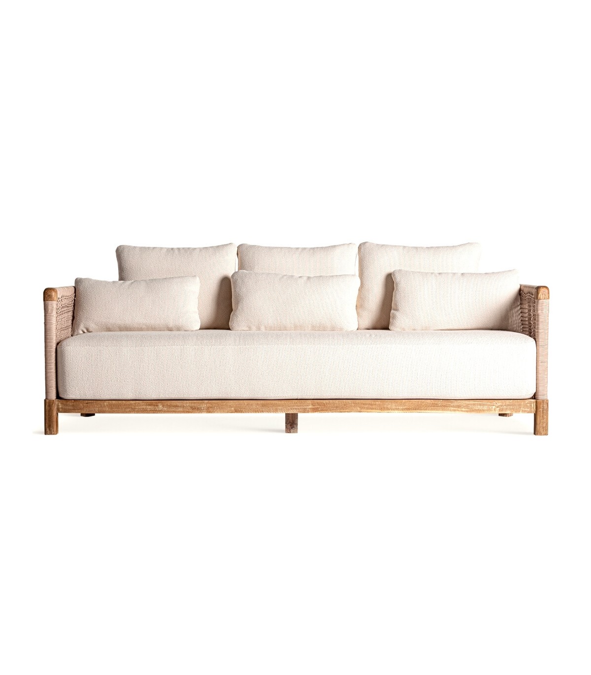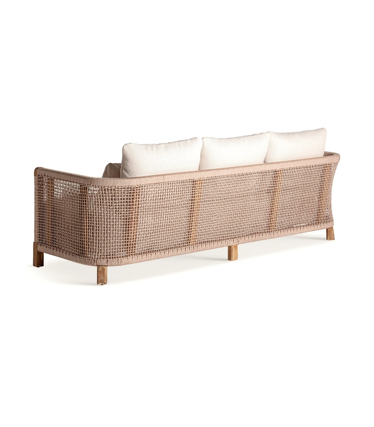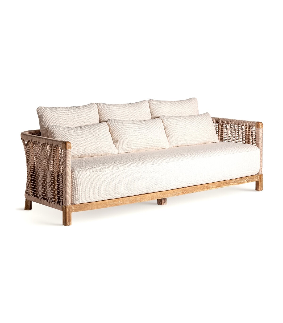 Sofá de 3 plazas, realizado en madera natural reciclada, cuerda polietileno natural, cojines en textil blanco hidrofugo, un sofá importante para exterior o porches.