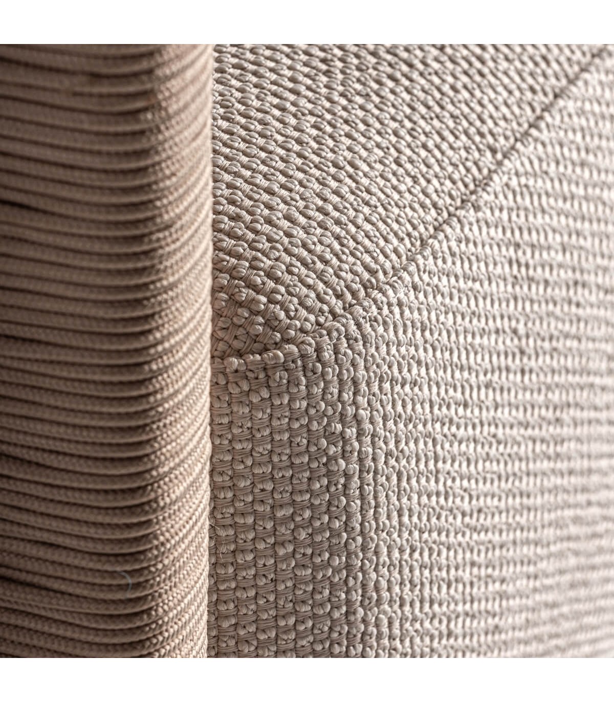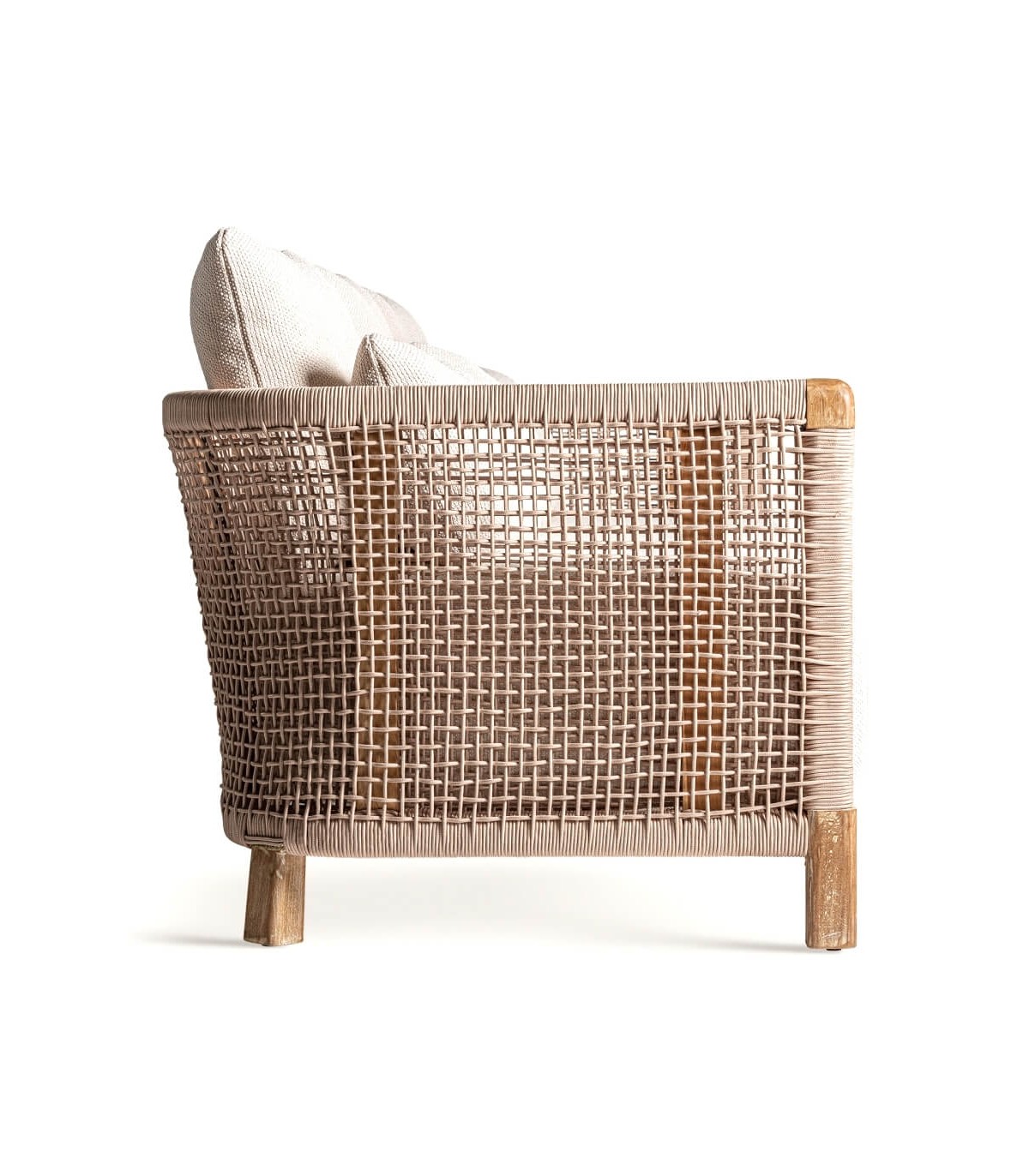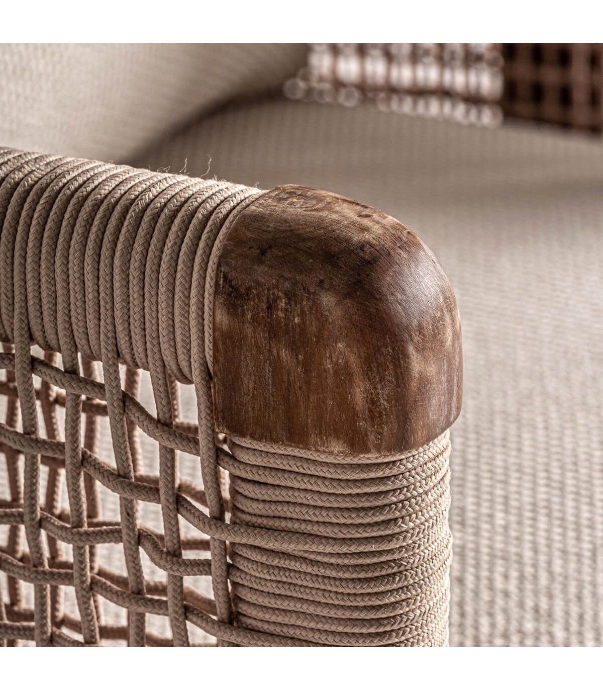 - Acabado, madera natural reciclada, cuerda polietileno natural, cojines en textil blanco.