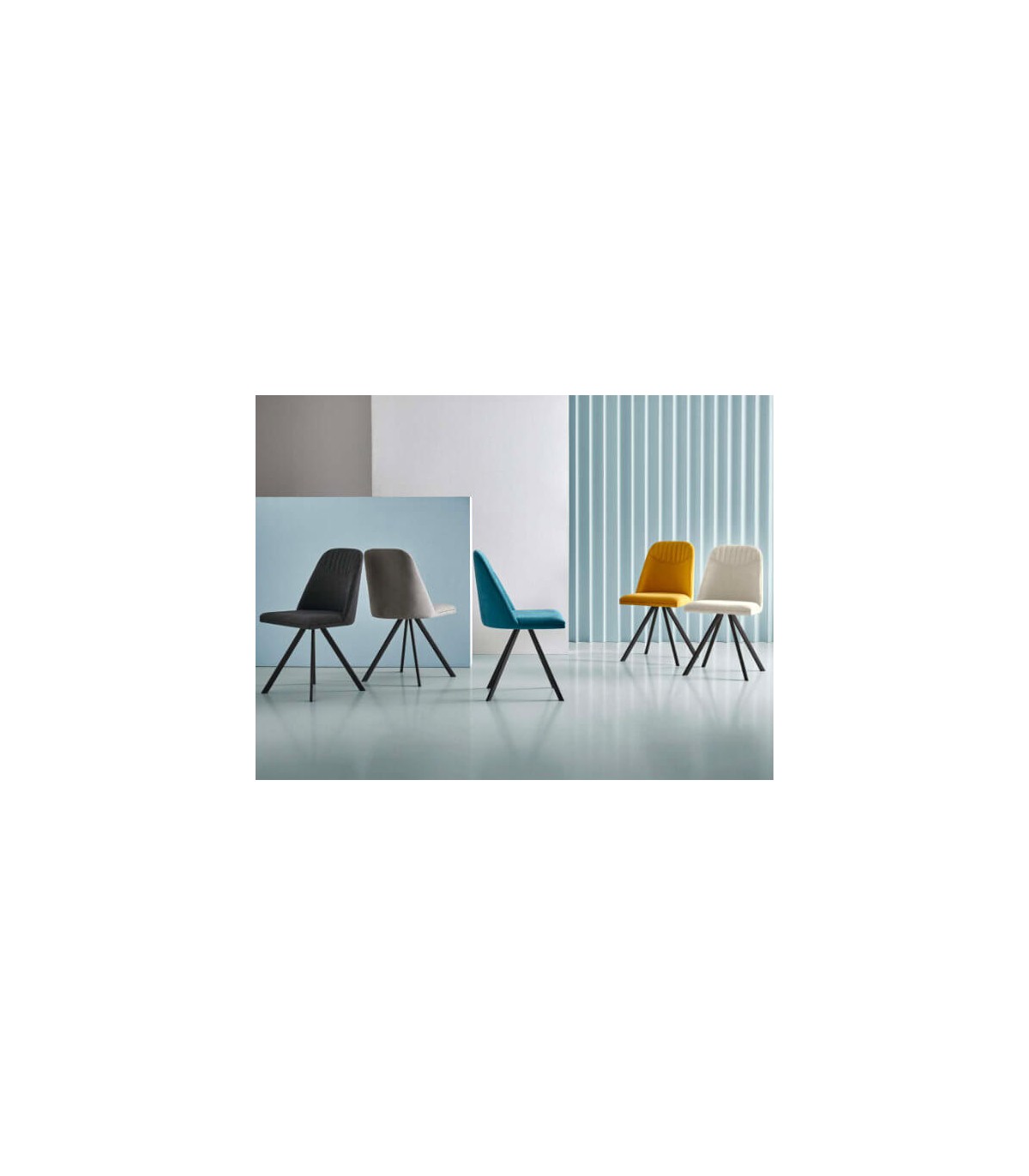 Silla tapizada de asiento giratorio con sistema retorno y diseño original. tapizada en color azul con las patas en metal negro, para cualquier tipo de decoración, la estructura metálica le aporta solidez mientras que el mullido del tapizado mucho confort, existe en más colores.