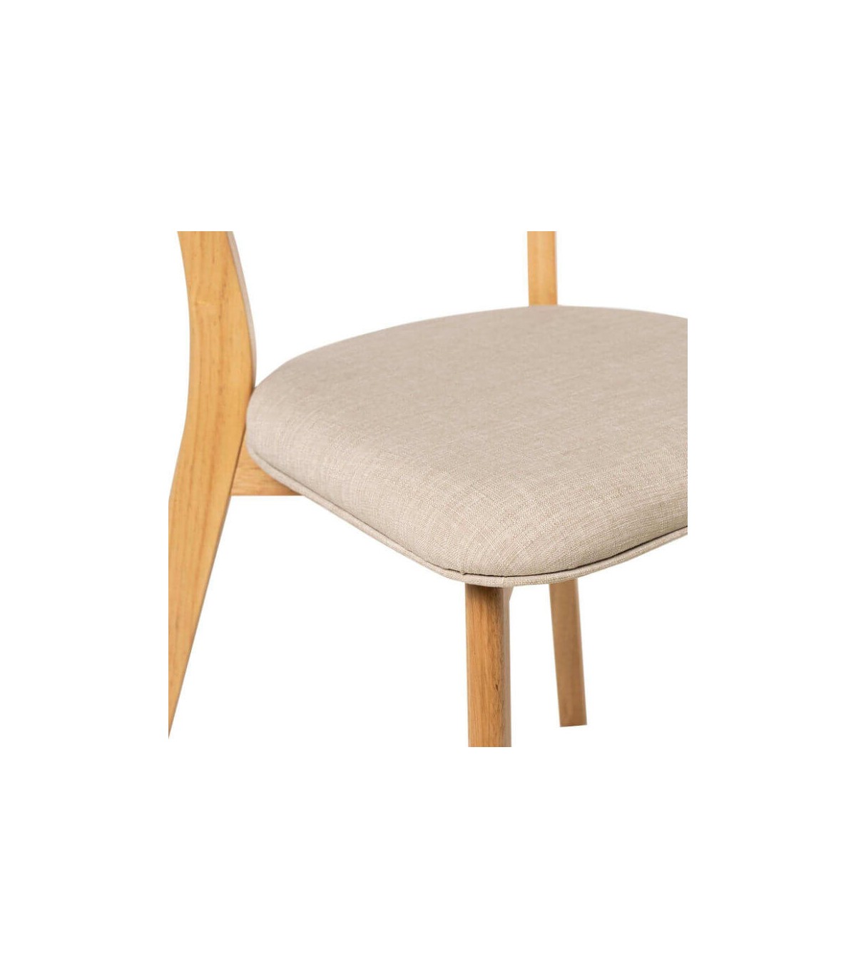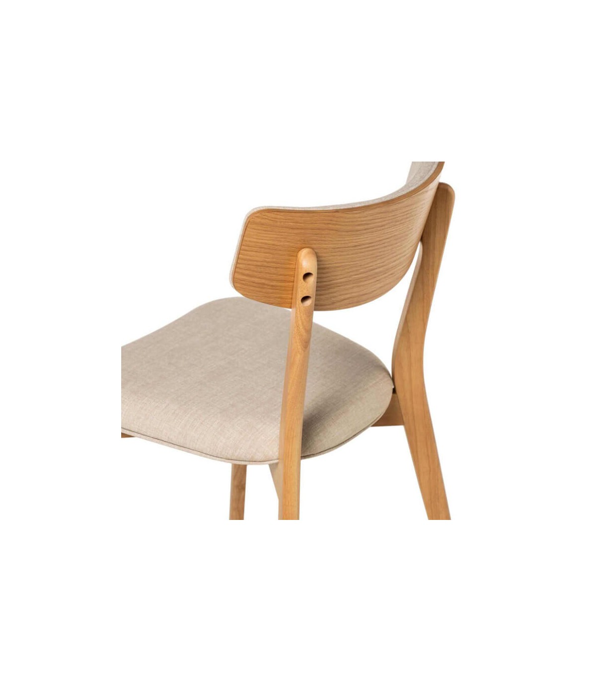 Aporta estilo y confort a tu hogar con esta silla de diseño contemporáneo, ideal para comedores, oficinas o salones. Su estructura en madera con chapa de roble natural ofrece un acabado cálido y sofisticado, mientras que su asiento y respaldo tapizados en chenilla beige proporcionan una comodidad excepcional. Sus líneas curvas y su diseño ligero la convierten en una pieza versátil y funcional para cualquier ambiente.