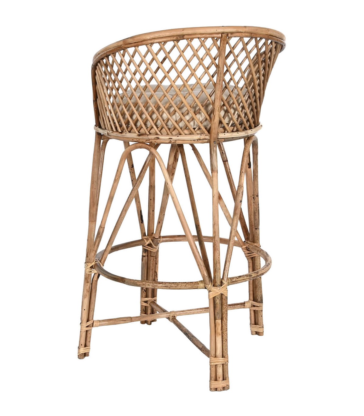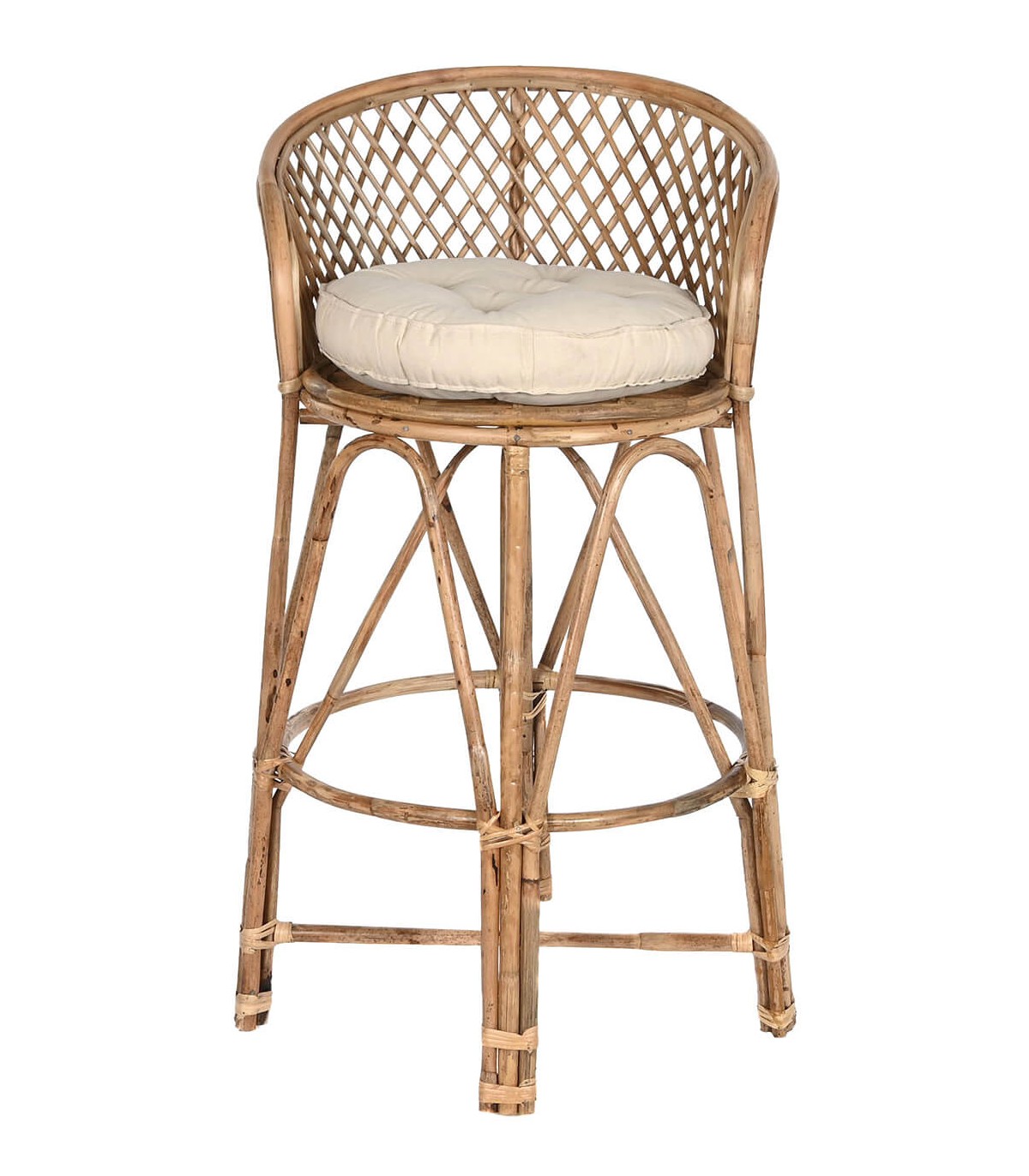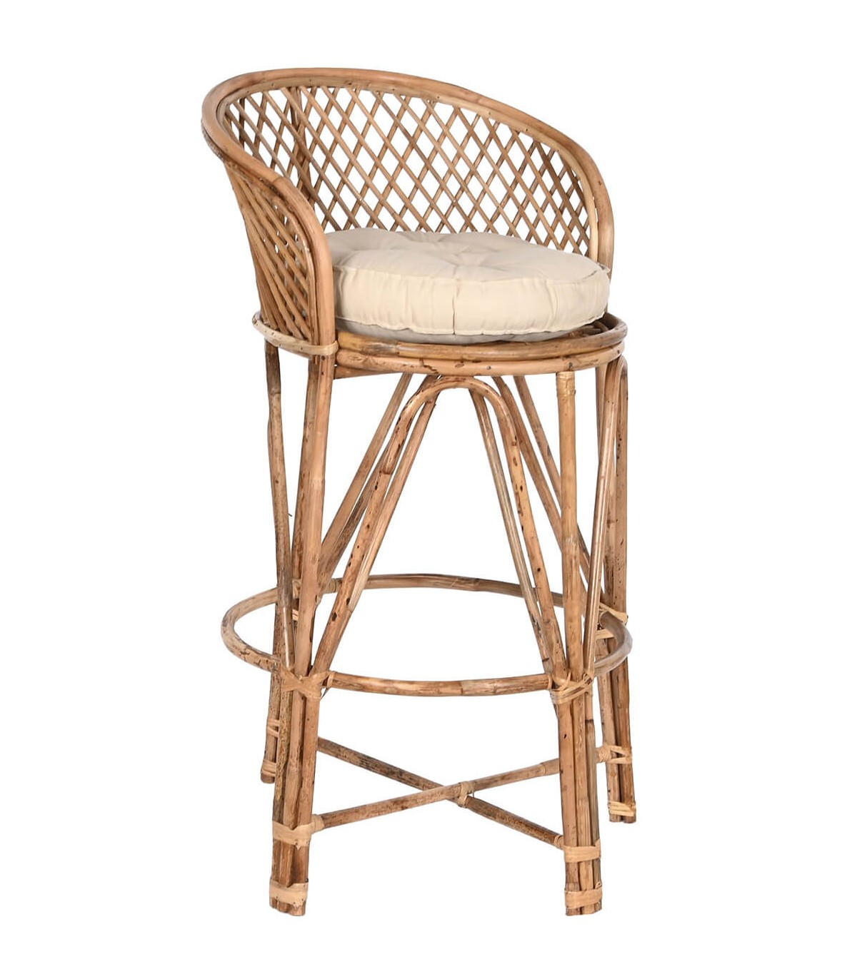Taburete realizado artesanalmente en ratán natural trenzado con un cojín en color crudo que le aporta comodidad y estética, indispensable en cualquier barra de estilo colonial.