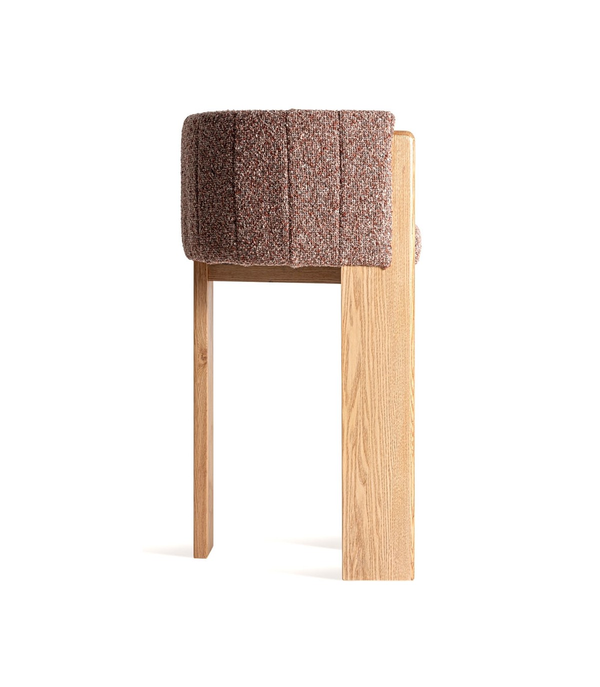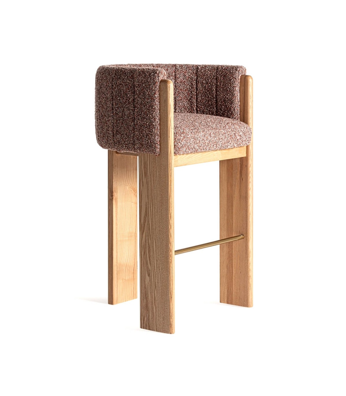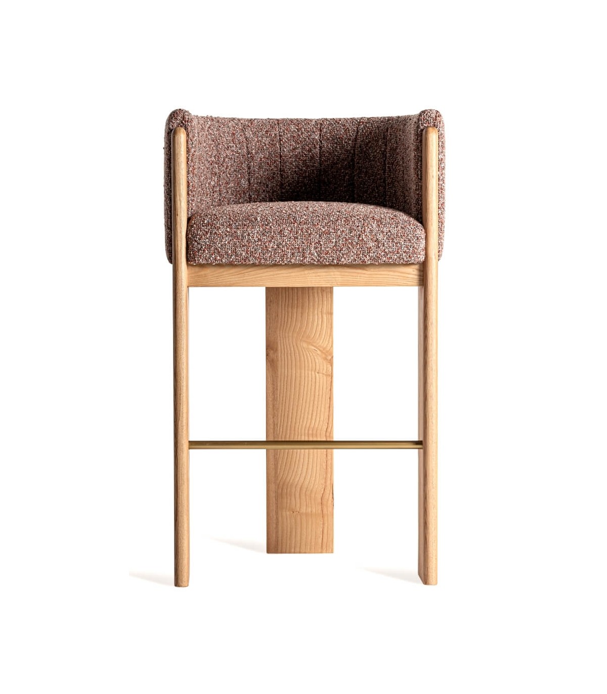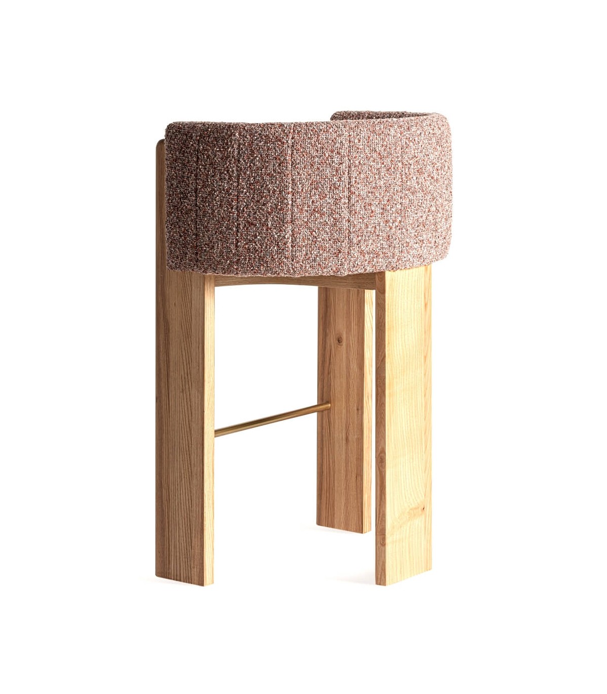 Taburete de barra muy cómodo, realizado en madera de roble con el detalle del metal dorado tapizado en tela boucle en tonos marrones, un taburete muy elegante.