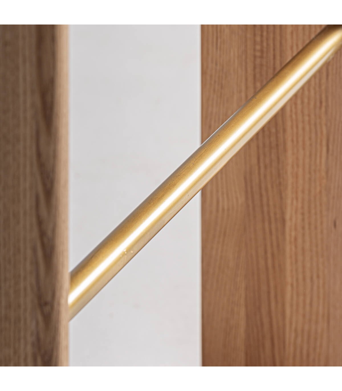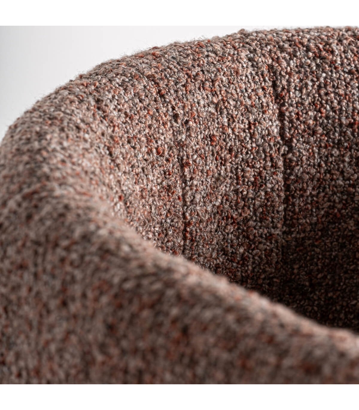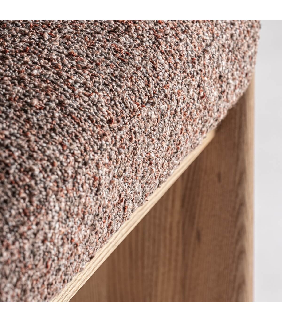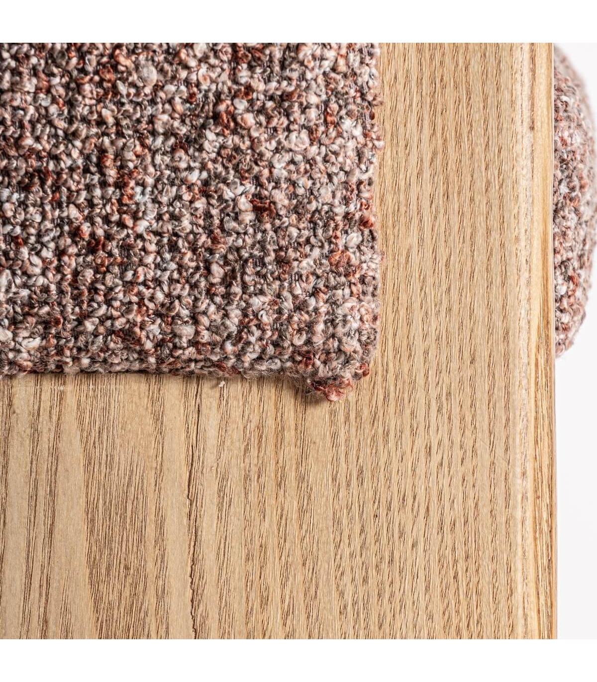 Acabado, madera natural, tela tipo boucle en tonos marrones, con un detalle en metal dorado.