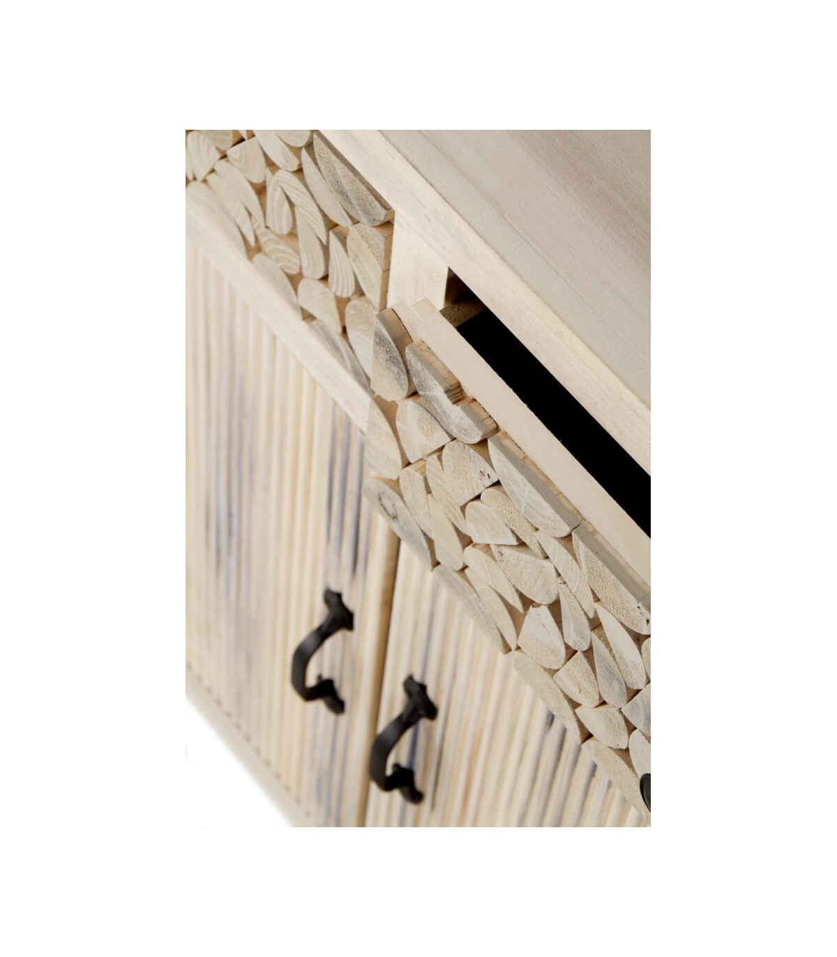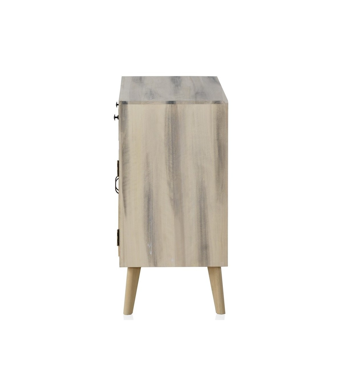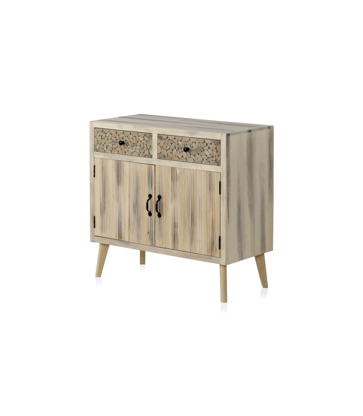 Acabado, artesanal, madera de álamo natural y tiradores en metal color negro.