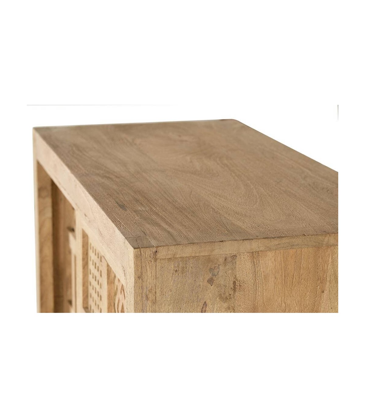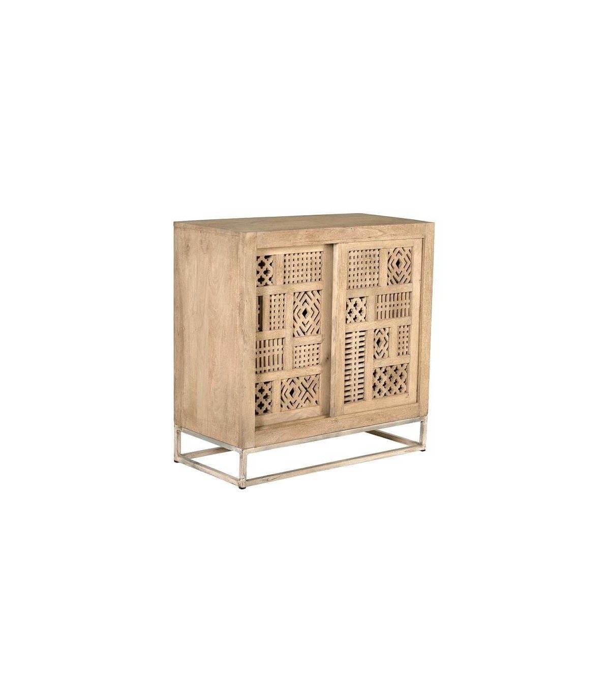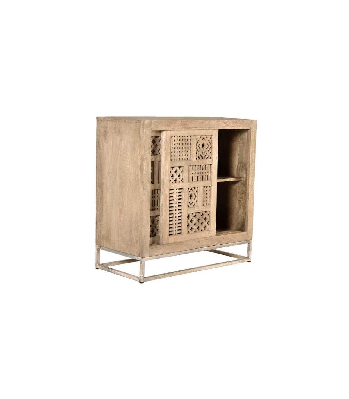 Taquillón de nuestra colección de muebles Mamba, una colección realizada en madera maciza de mango tallada a mano acabada en natural, a caballo entre el estilo étnico y el toque contemporáneo que nos da la base en metal a juego de la madera, una colección muy versátil y decorativa.