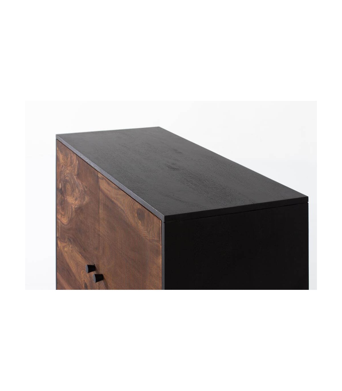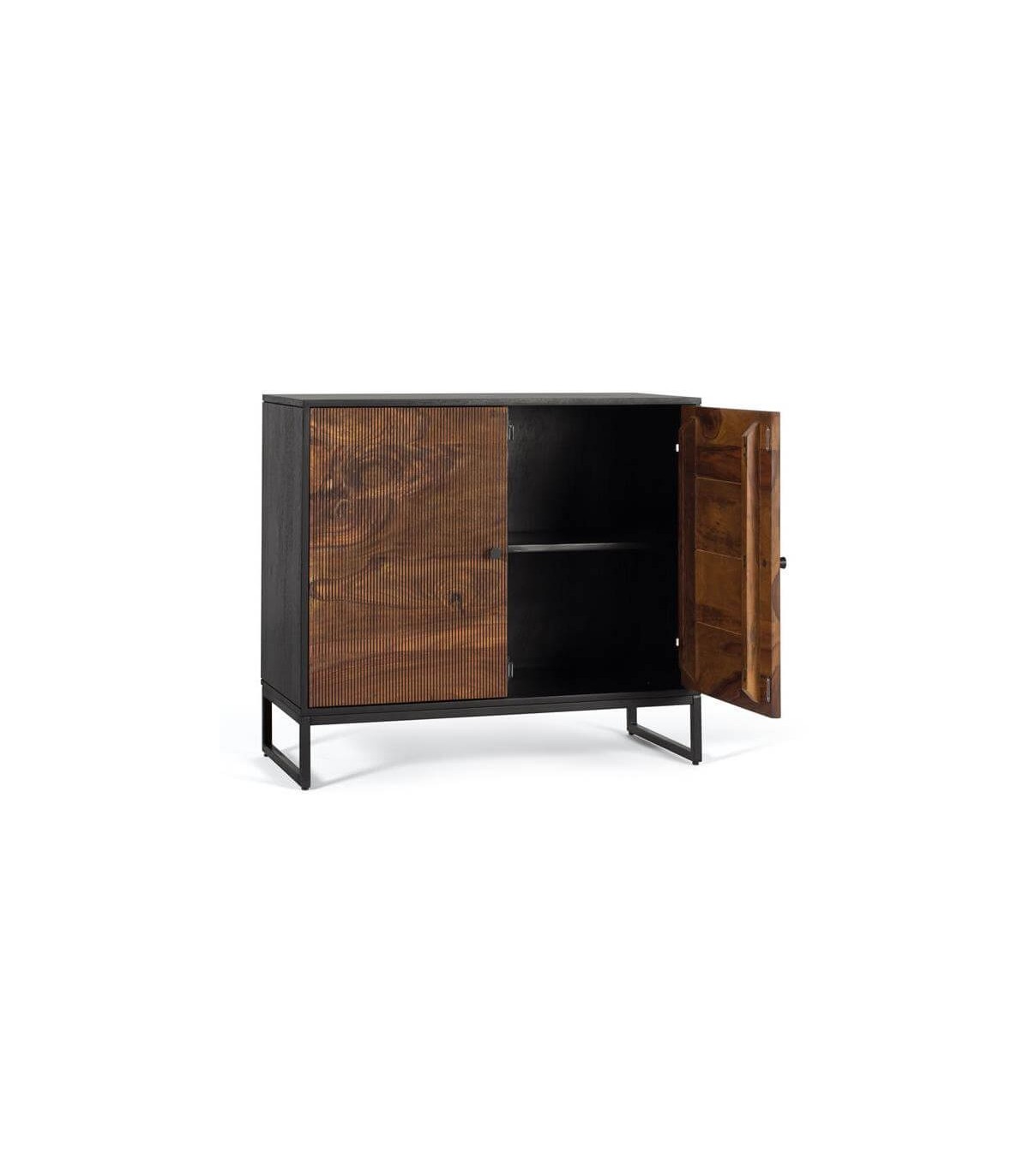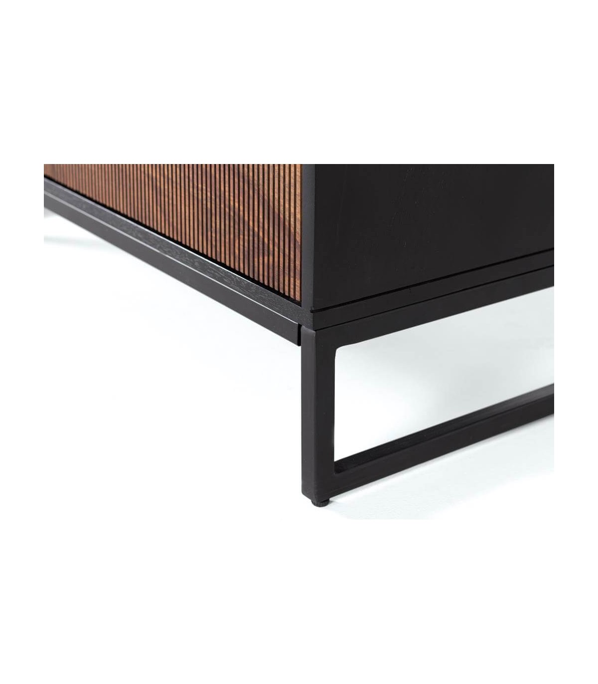 Acabado, puertas de madera de palisandro y estructura en madera de mango color negro, patas en metal color negro.