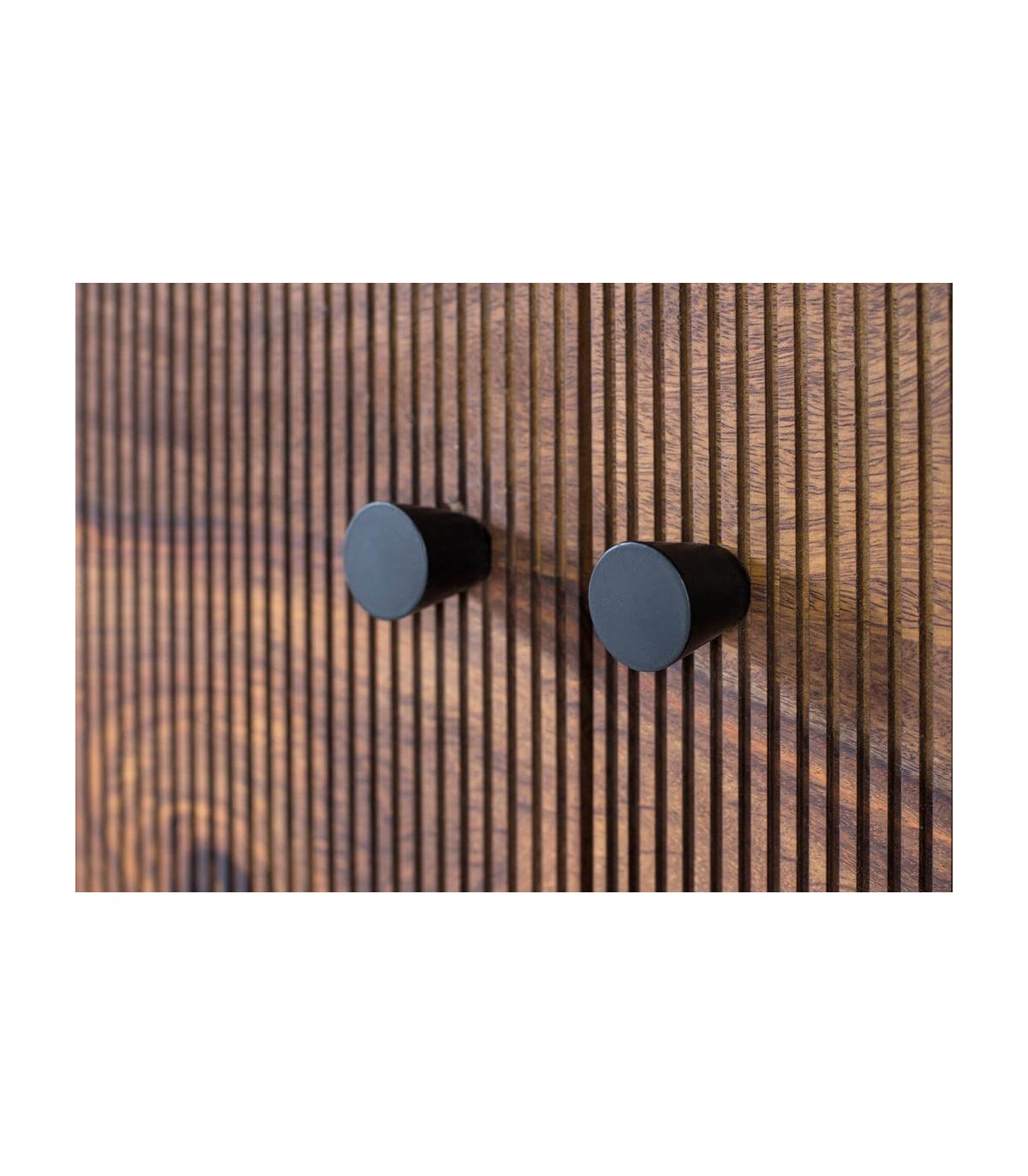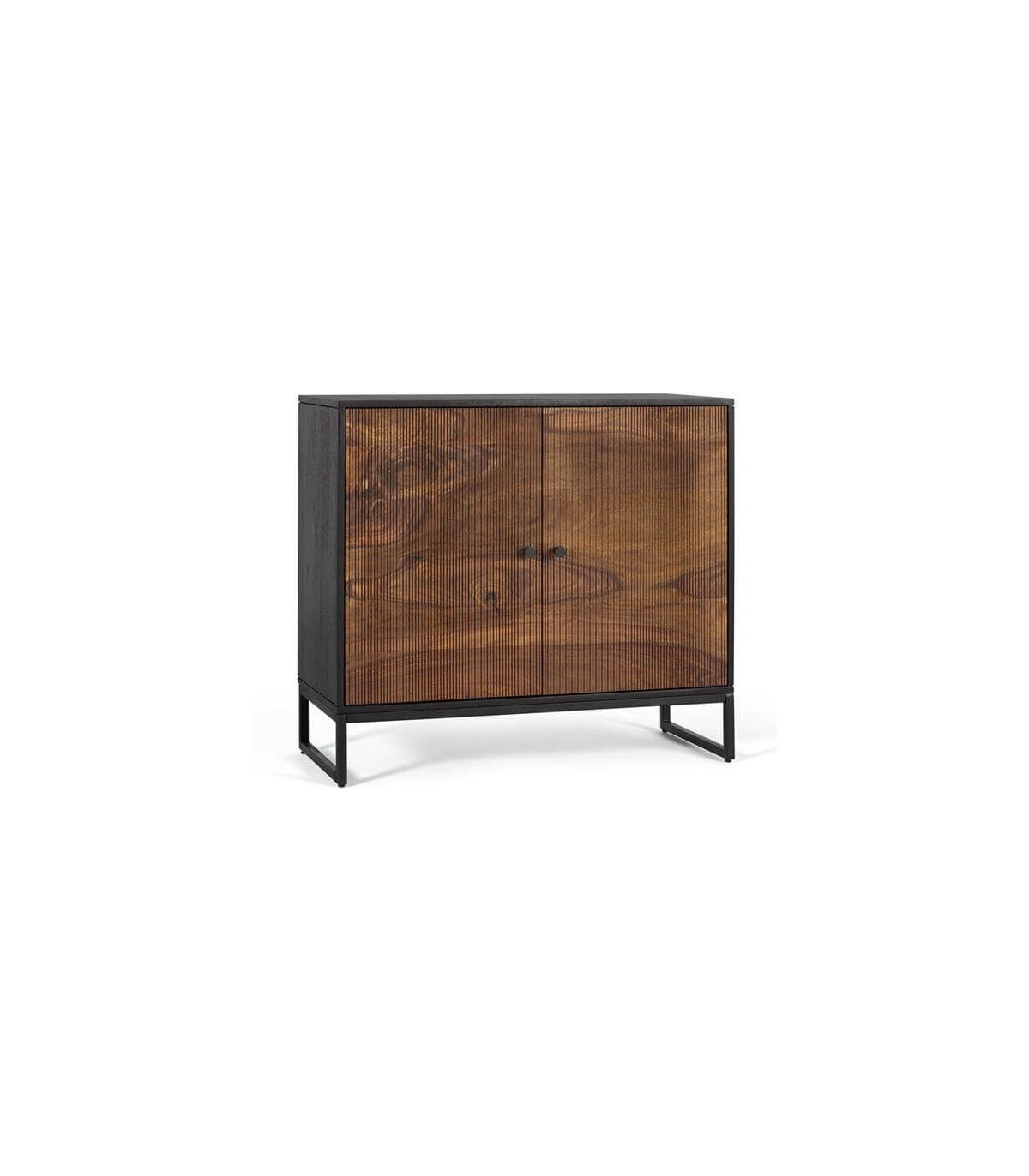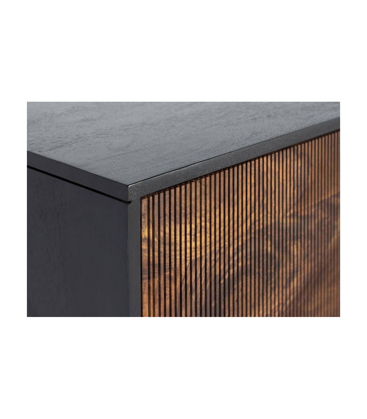 Acabado, puertas de madera de palisandro y estructura en madera de mango color negro, patas en metal color negro.