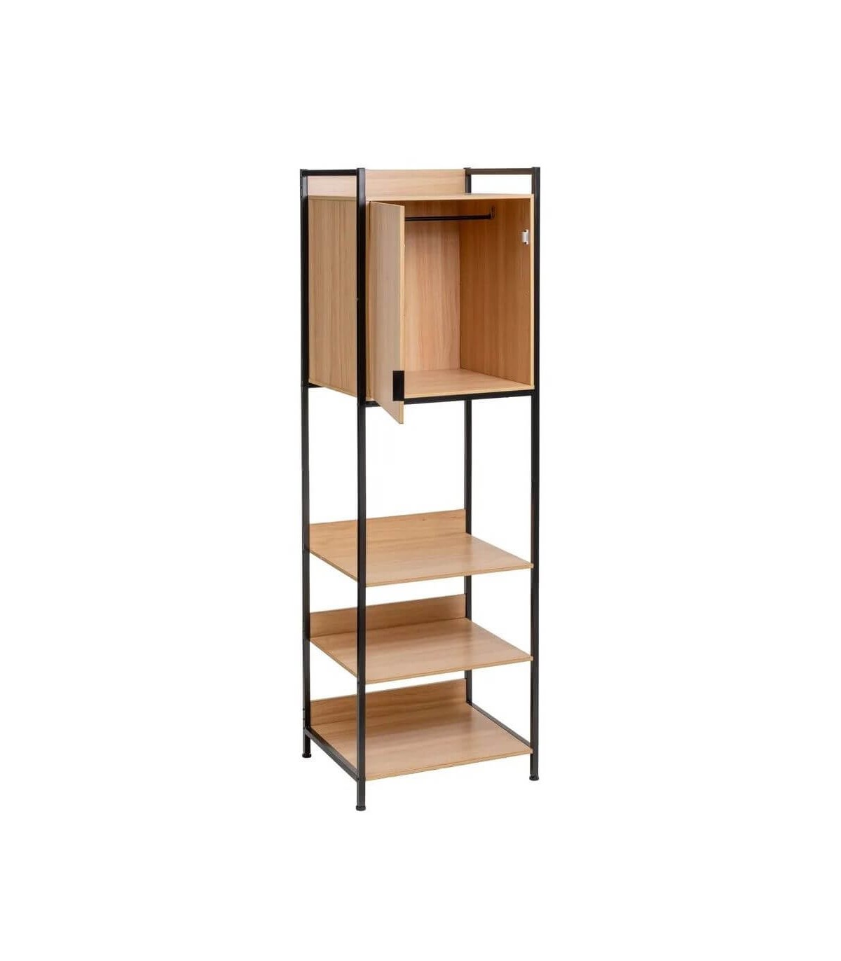 Dale un toque moderno y versátil a tu dormitorio con este armario ropero modular. Su estructura en melamina de imitación haya natural y detalles en metal negro aportan un estilo industrial y contemporáneo que combina con cualquier decoración.