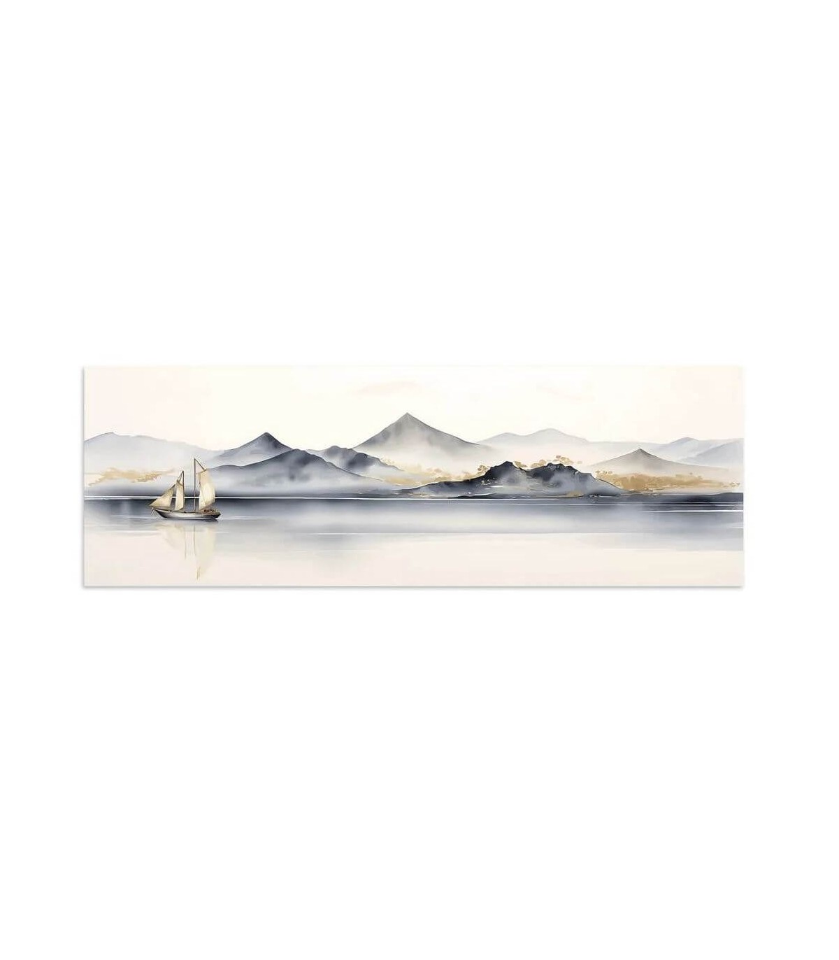 Cuadro horizontal de inspiración oriental que transmite serenidad y profundidad visual a través de un paisaje montañoso envuelto en tonos grises y ocres. La sutileza de su composición aporta equilibrio y calma, evocando la bruma del amanecer sobre el agua y las líneas suaves del horizonte.
