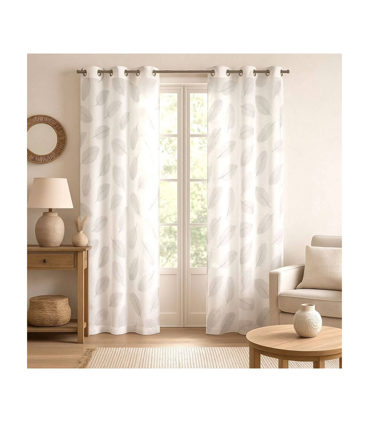 Set de dos visillos ligeros y vaporosos que filtran la luz suavemente, aportando claridad y frescura al ambiente. Confeccionados en poliéster de alta calidad, destacan por su textura fluida y caída elegante. El estampado gris plata dibuja un motivo sutil que introduce un toque decorativo sin restar luminosidad.
