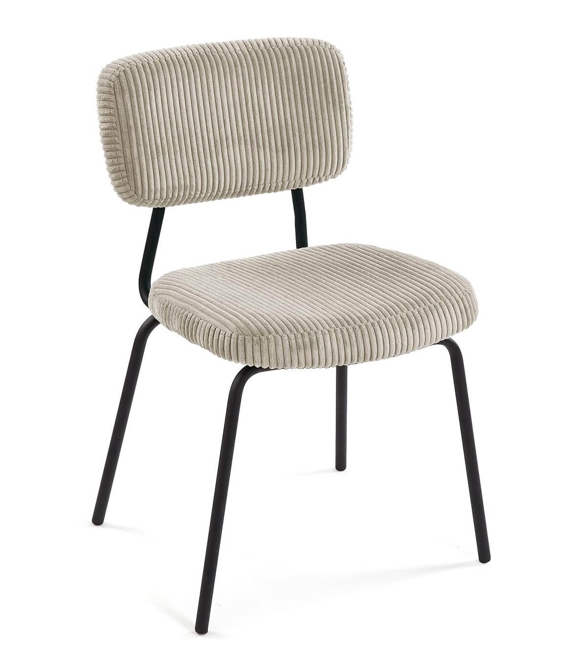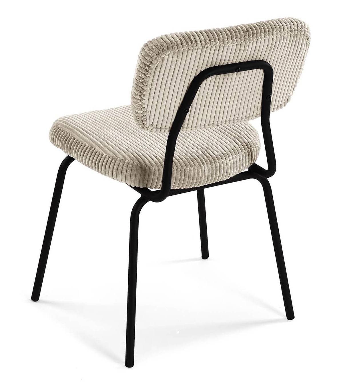 Silla de comedor muy cómoda, con el asiento y el respaldo tapizados, estilo industrial, con la estructura en acero acabada en negro y el tapizado en pana color beige, perfecta para crear ambientes sofisticados y elegantes.